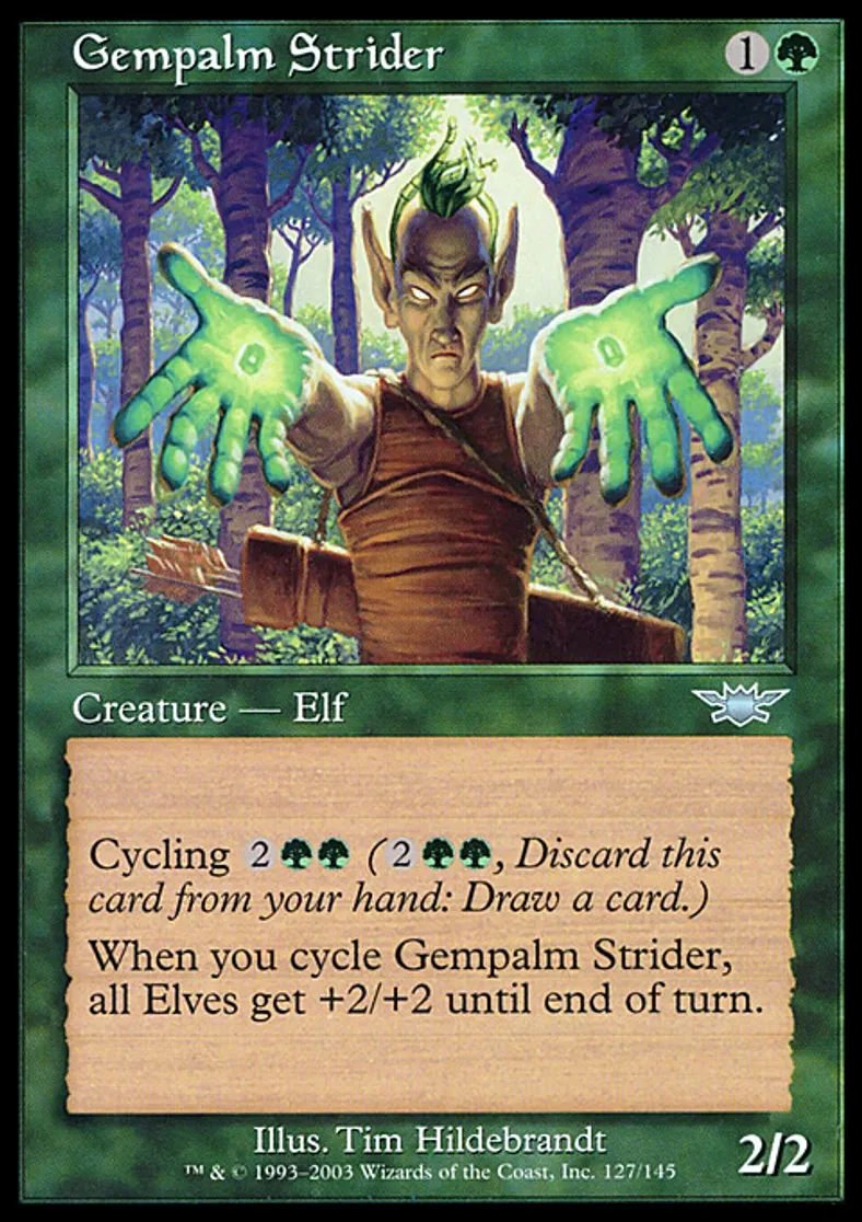 | Oracle Text | Cycling {{2}}{{g}}{{g}} ({{2}}{{g}}{{g}}, Discard this card: Draw a card.) When you cycle Gempalm Strider, Elf creatures get +2/+2 until end of turn. | ||