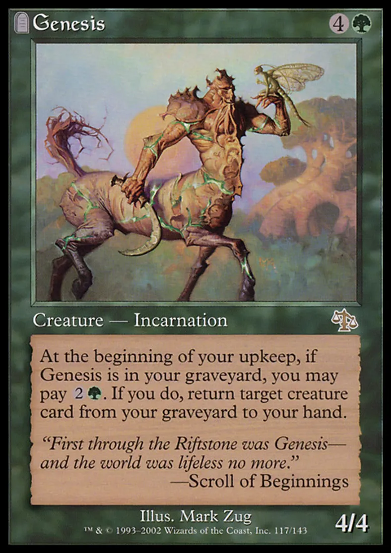 | Oracle Text | At the beginning of your upkeep, if Genesis is in your graveyard, you may pay {{2}}{{g}}. If you do, return target creature card from your graveyard to your hand. | ||