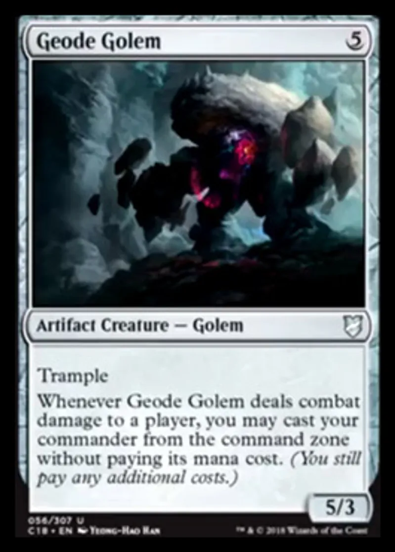 | Oracle Text | Trample Whenever Geode Golem deals combat damage to a player, you may cast your commander from the command zone without paying its mana cost. (You still pay any additional costs.) | ||