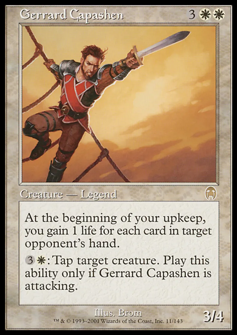 | Oracle Text | At the beginning of your upkeep, you gain 1 life for each card in target opponent's hand. {{3}}{{w}}: Tap target creature. Activate this ability only if Gerrard Capashen is attacking. | ||