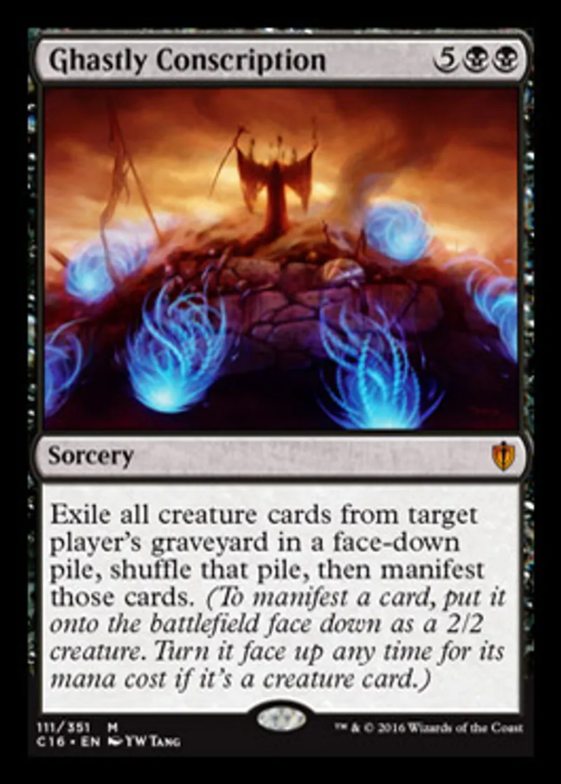 | Oracle Text | Exile all creature cards from target player's graveyard in a face-down pile, shuffle that pile, then manifest those cards. (To manifest a card, put it onto the battlefield face down as a 2/2 creature. Turn it face up any time for its mana cost if it's a creature card.) | ||