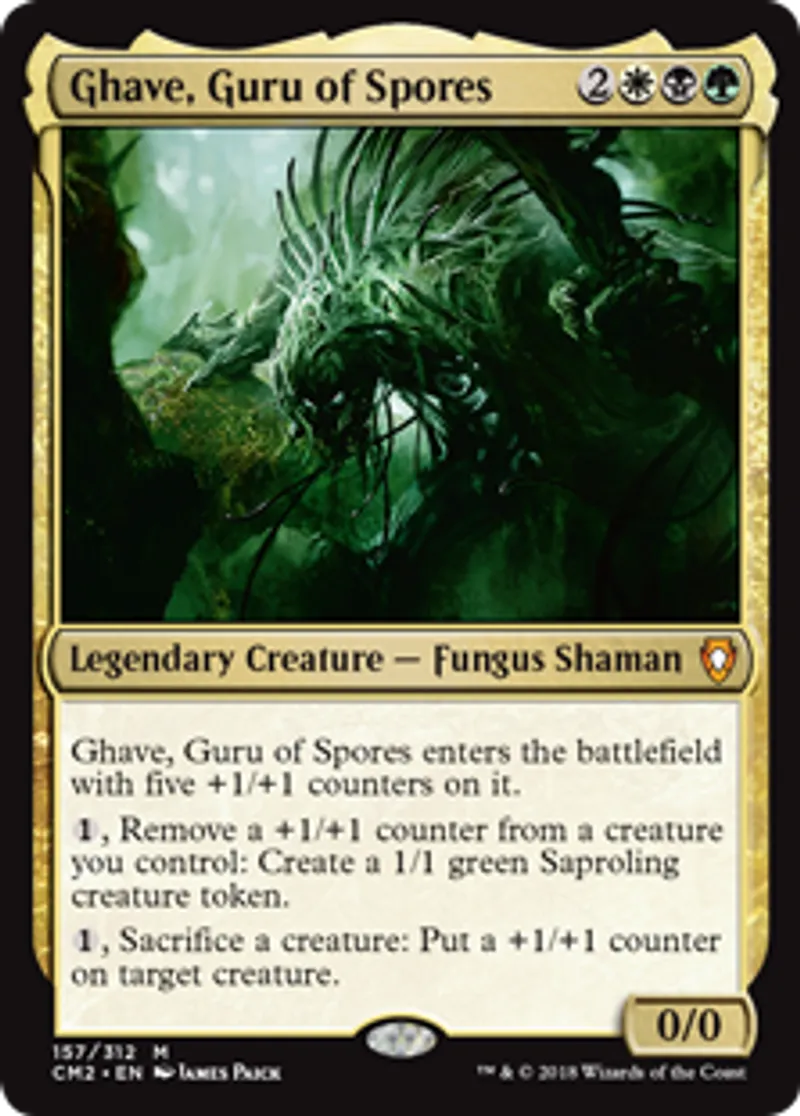 | Oracle Text | Ghave, Guru of Spores enters the battlefield with five +1/+1 counters on it. {{1}}, Remove a +1/+1 counter from a creature you control: Create a 1/1 green Saproling creature token. {{1}}, Sacrifice a creature: Put a +1/+1 counter on target creature. | ||