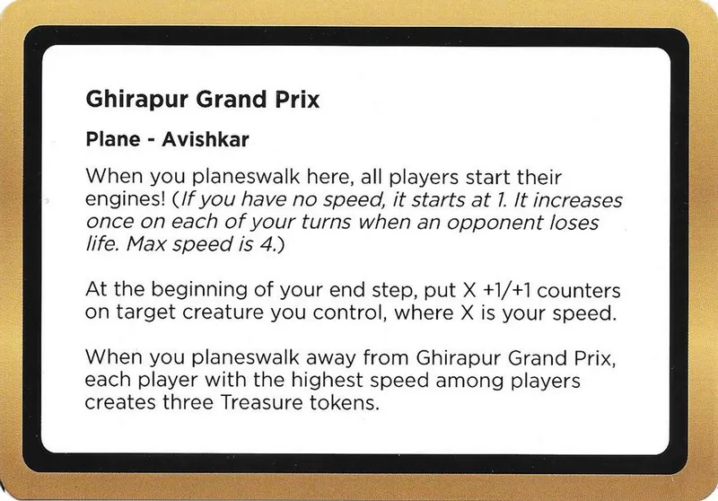 | Oracle Text | when you planeswalk here, all players start their engines! (if you have no speed, it starts at 1. it increases once on each of your turns when an opponent loses life. max speed is 4.) at the beginning of your end step, put x +1/+1 counters on target creature you control, where x is your speed. when you planeswalk away from ghirapur grand prix, each player with the highest speed among players creates three treasure tokens. | ||