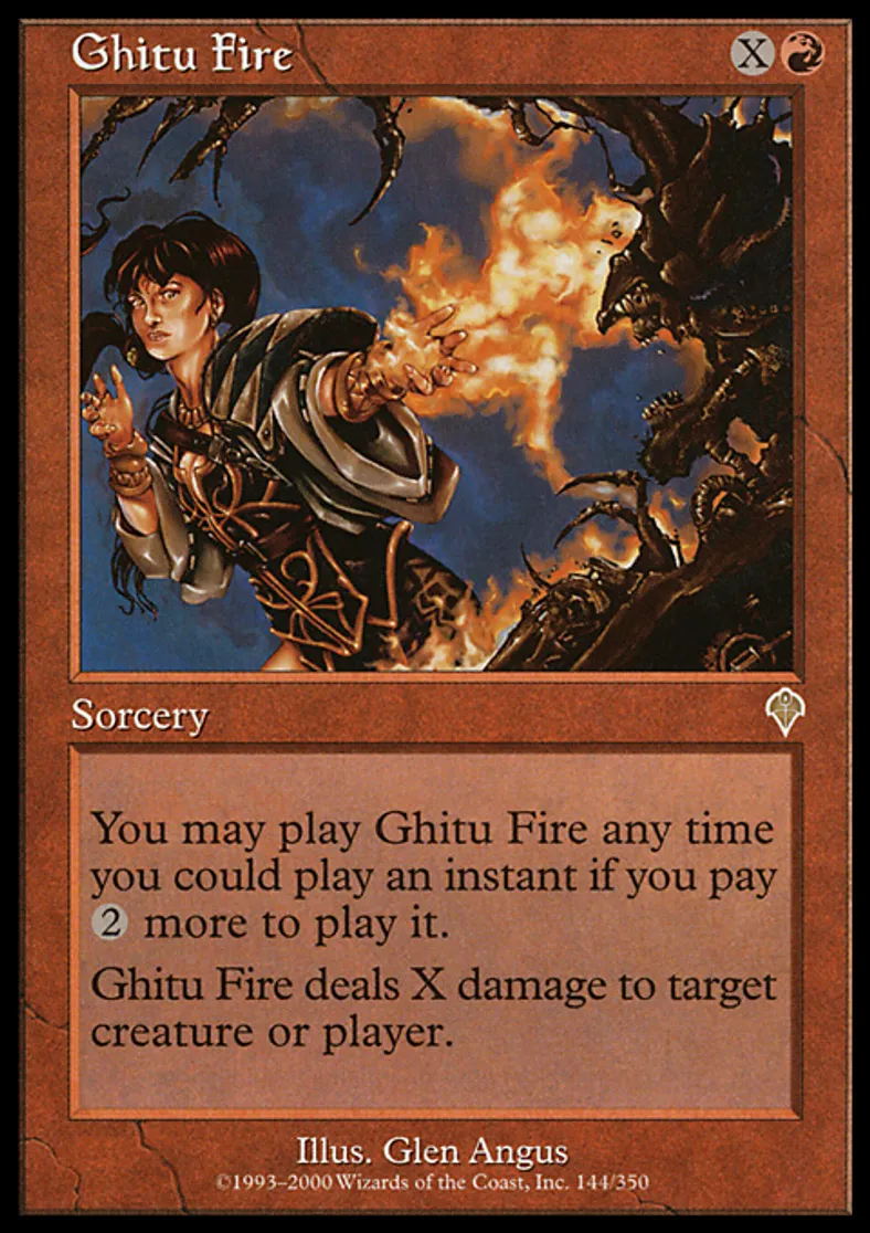 | Oracle Text | You may cast Ghitu Fire any time you could cast an instant if you pay {{2}} more to cast it. Ghitu Fire deals X damage to target creature or player. | ||