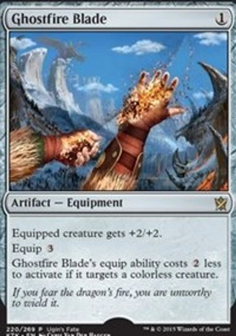 | Oracle Text | Equipped creature gets +2/+2. Equip {{3}} Ghostfire Blade's equip ability costs {{2}} less to activate if it targets a colorless creature. | ||
