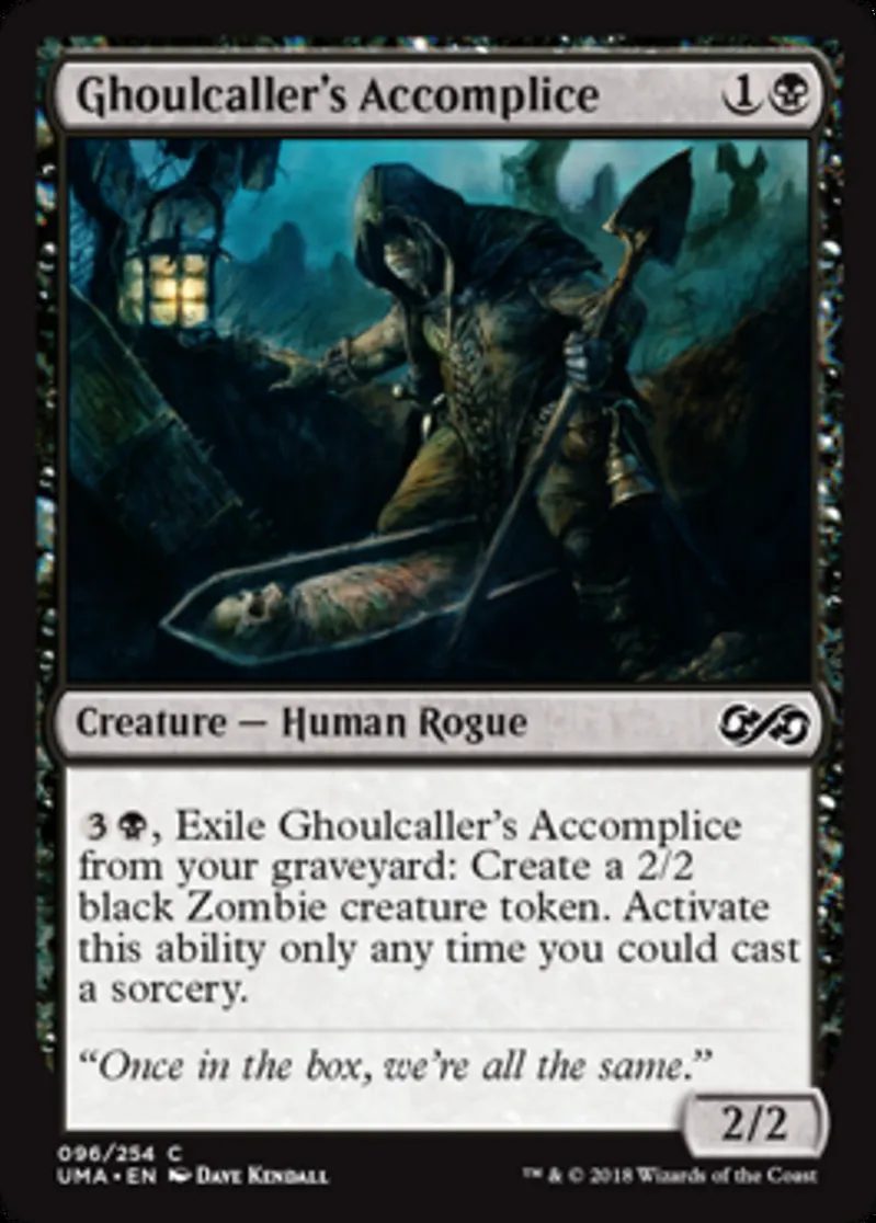| Oracle Text | {{3}}{{b}}, Exile Ghoulcaller's Accomplice from your graveyard: Create a 2/2 black Zombie creature token. Activate this ability only any time you could cast a sorcery. | ||