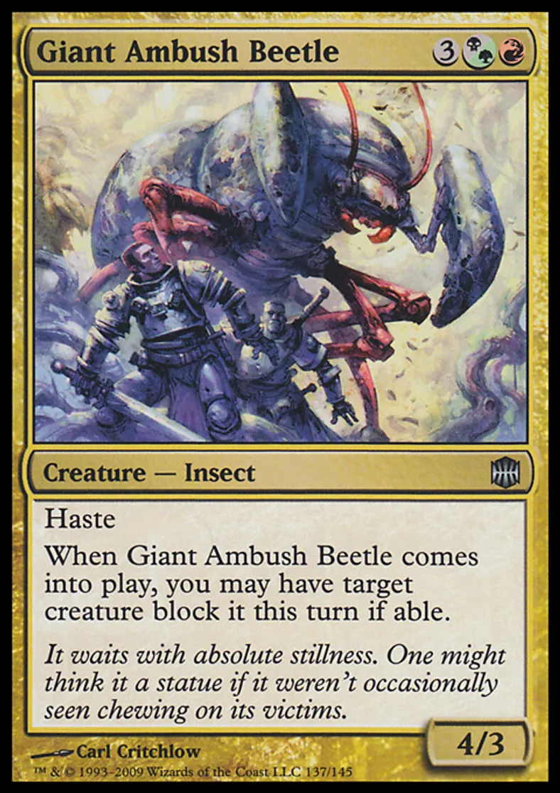 | Oracle Text | Haste When Giant Ambush Beetle enters the battlefield, you may have target creature block it this turn if able. | ||