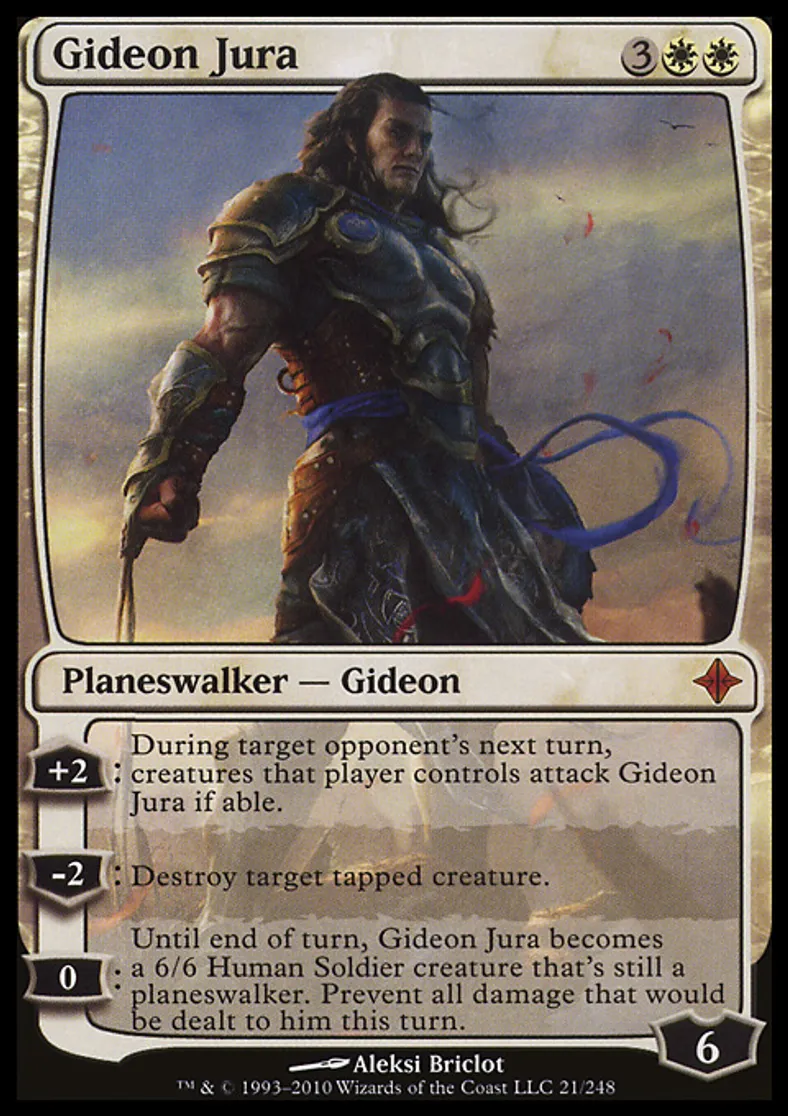 | Oracle Text | +2: During target opponent's next turn, creatures that player controls attack Gideon Jura if able. -2: Destroy target tapped creature. 0: Until end of turn, Gideon Jura becomes a 6/6 Human Soldier creature that's still a planeswalker. Prevent all damage that would be dealt to him this turn. | ||
