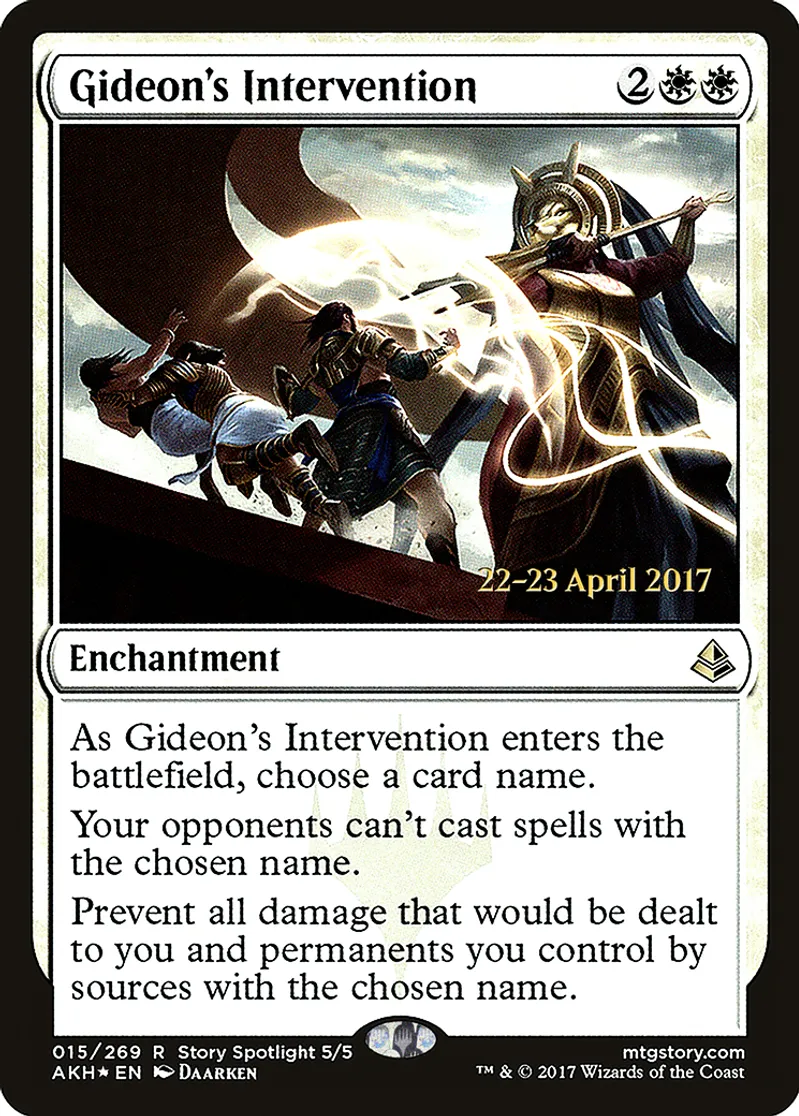 | Oracle Text | As Gideon's Intervention enters the battlefield, choose a card name.