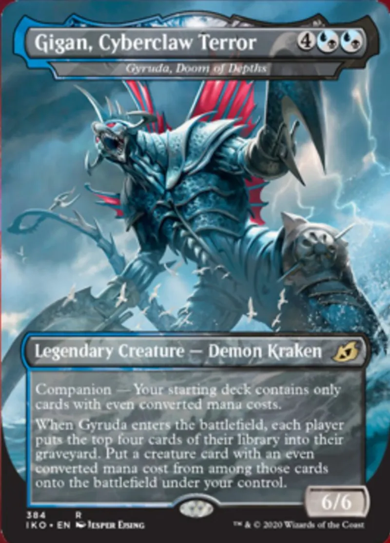 When Gyruda, Doom of Depths enters the battlefield, each player puts the top four cards of the library into their graveyard. Put a creature card with an even converted mana cost from among those cards onto the battlefield under your control. | ||