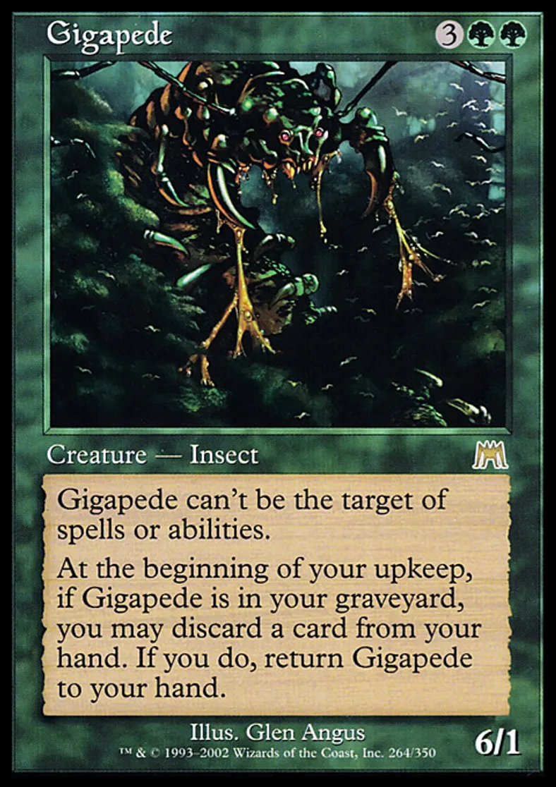 | Oracle Text | Shroud (This permanent can't be the target of spells or abilities.) At the beginning of your upkeep, if Gigapede is in your graveyard, you may discard a card. If you do, return Gigapede to your hand. | ||