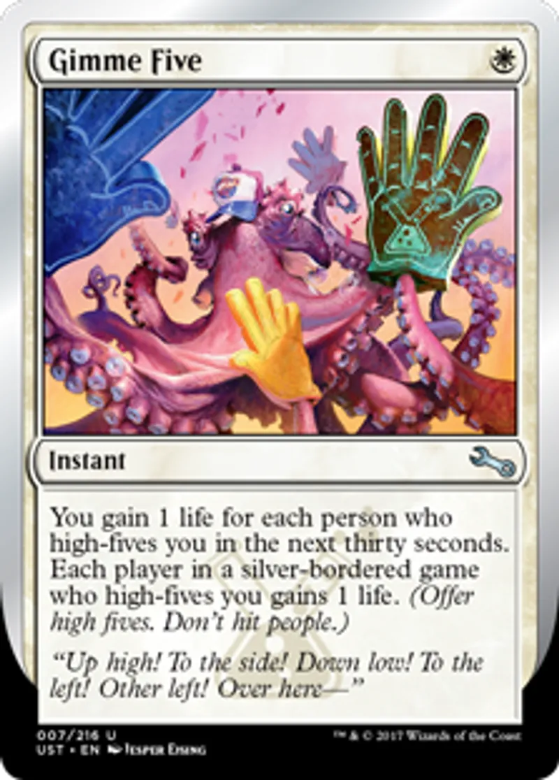 | Oracle Text | You gain 1 life for each person who high-fives you in the next thirty seconds. Each player in a silver-bordered game who high-fives you gains 1 life. (Offer high fives. Don't hit people.) | ||