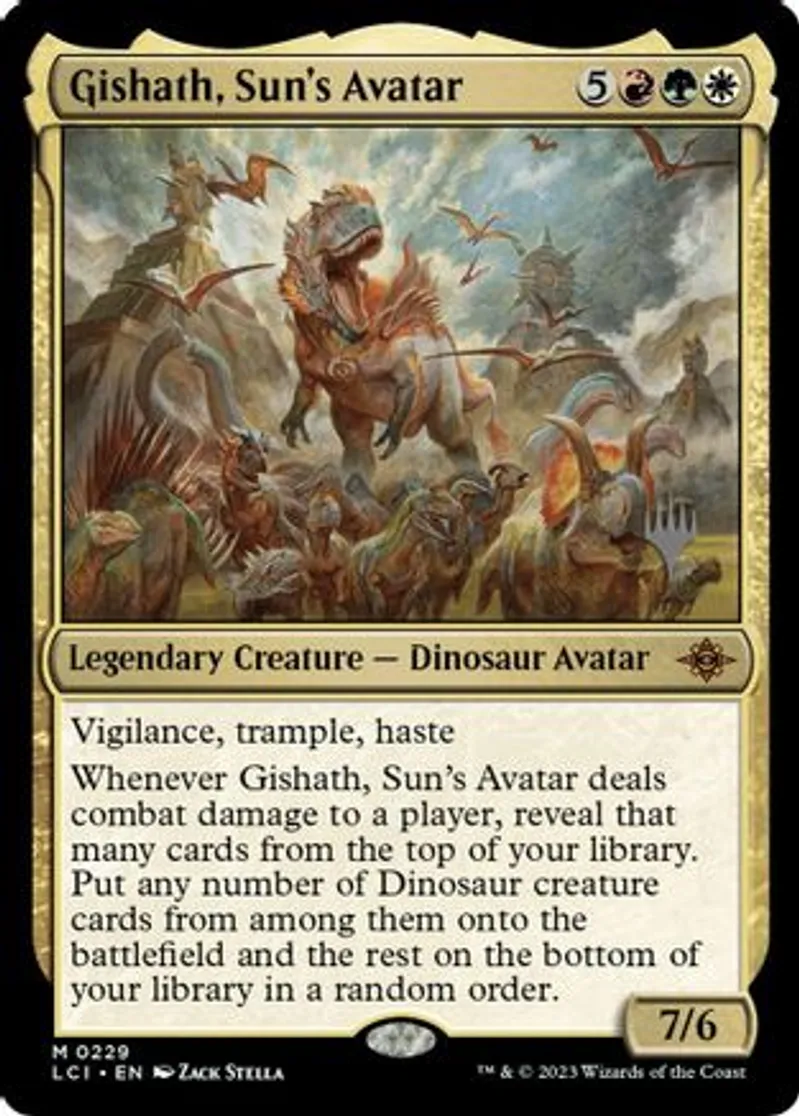 Magic: the Gathering (mtg) Mythic Rare Legendary Creature — Dinosaur Avatar Gishath, Sun's Avatar from Promo Pack: The Lost Caverns of Ixalan (PLCI) last updated 2025-12-21 15:43:06