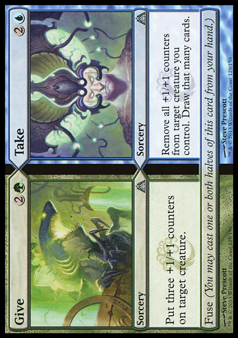 | Oracle Text | Remove all +1/+1 counters from target creature you control. Draw that many cards. Fuse (You may cast one or both halves of this card from your hand.) | ||