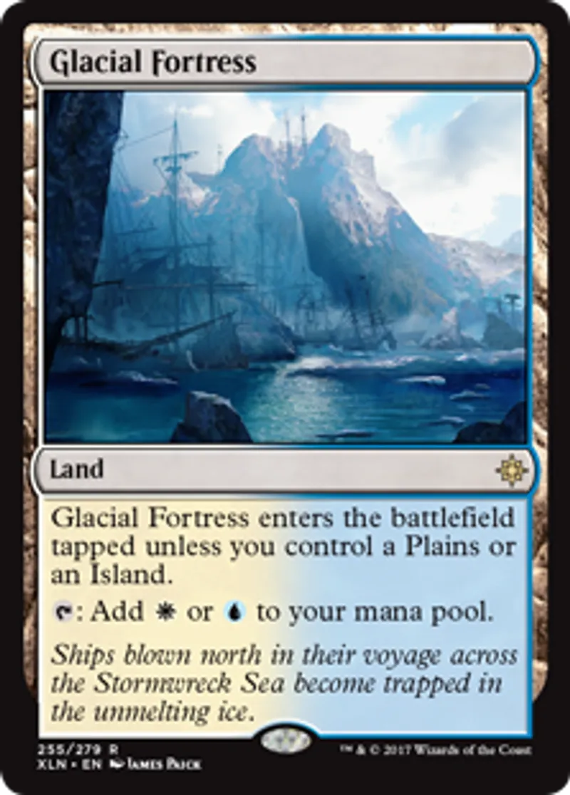 | Oracle Text | Glacial Fortress enters the battlefield tapped unless you control a Plains or an Island. {{t}}: Add {{w}} or {{u}} to your mana pool. | ||