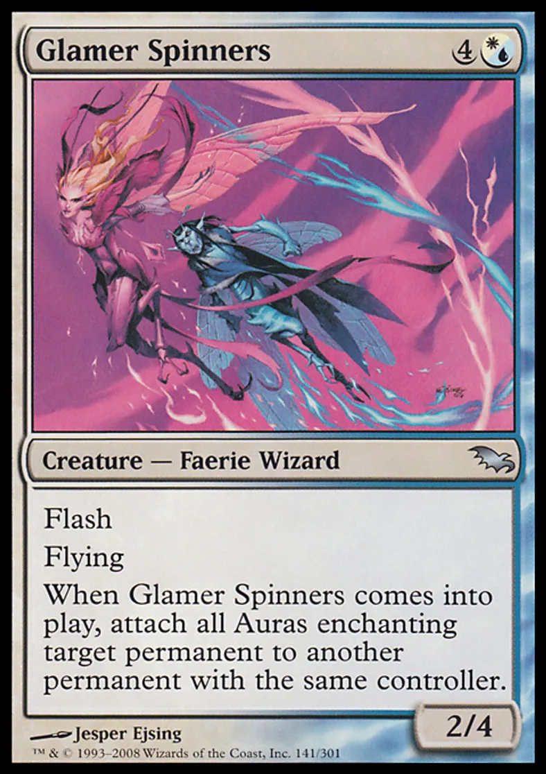| Oracle Text | Flash Flying When Glamer Spinners enters the battlefield, attach all Auras enchanting target permanent to another permanent with the same controller. | ||