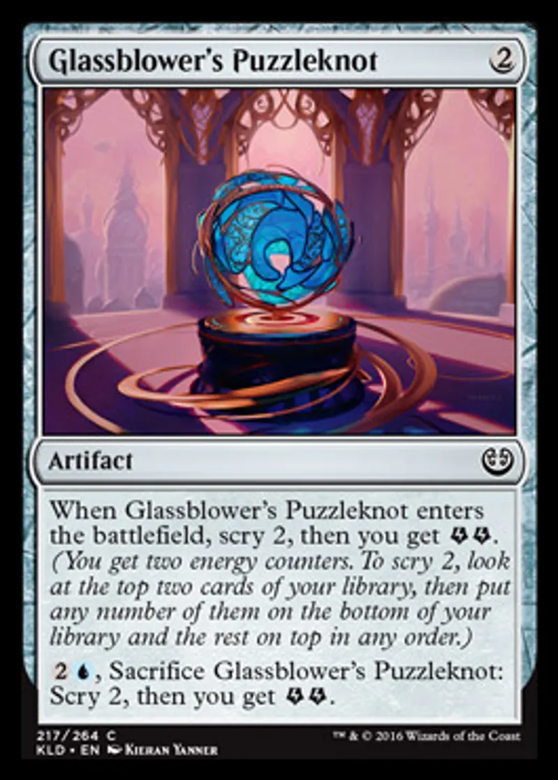 | Oracle Text | When Glassblower's Puzzleknot enters the battlefield, scry 2, then you get {{Energy}}{{Energy}}. (You get two energy counters. To scry 2, look at the top two cards of your library, then put any number of them on the bottom of your library and the rest on top in any order.) {{2}}{{u}}, Sacrifice Glassblower's Puzzleknot: Scry 2, then you get {{Energy}}{{Energy}}. | ||