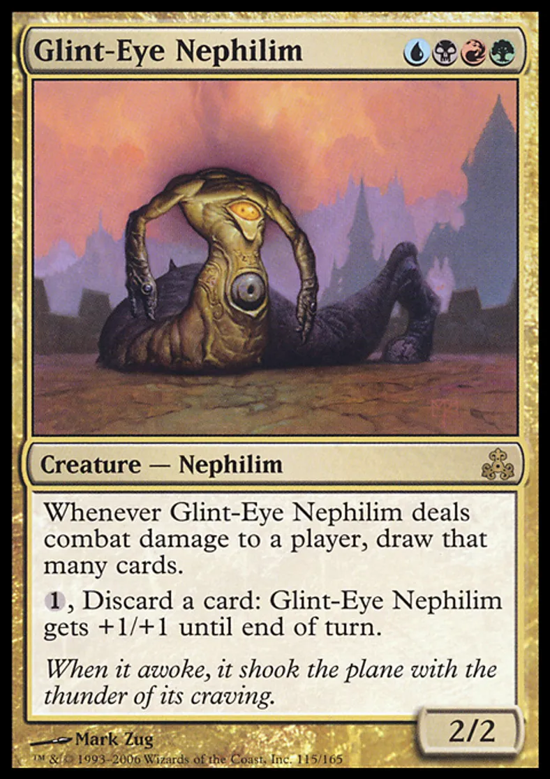 | Oracle Text | Whenever Glint-Eye Nephilim deals combat damage to a player, draw that many cards. {{1}}, Discard a card: Glint-Eye Nephilim gets +1/+1 until end of turn. | ||