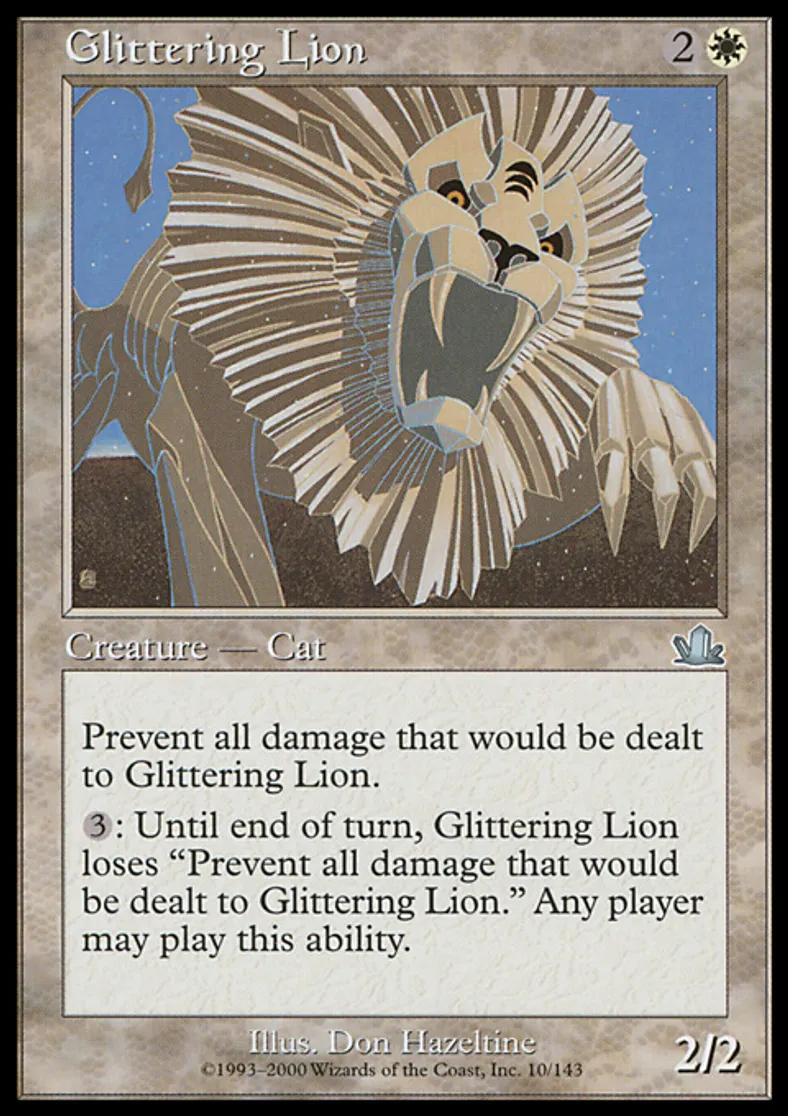 | Oracle Text | Prevent all damage that would be dealt to Glittering Lion. {{3}}: Until end of turn, Glittering Lion loses "Prevent all damage that would be dealt to Glittering Lion." Any player may activate this ability. | ||