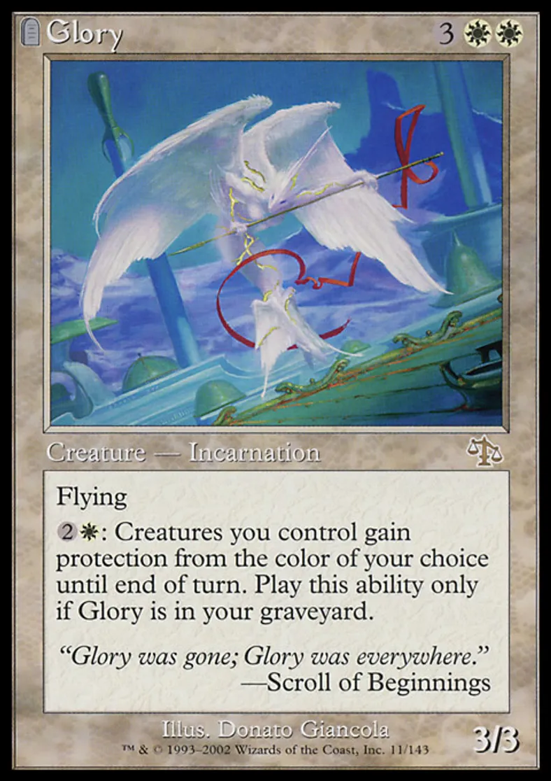 | Oracle Text | Flying {{2}}{{w}}: Choose a color. Creatures you control gain protection from the chosen color until end of turn. Activate this ability only if Glory is in your graveyard. | ||