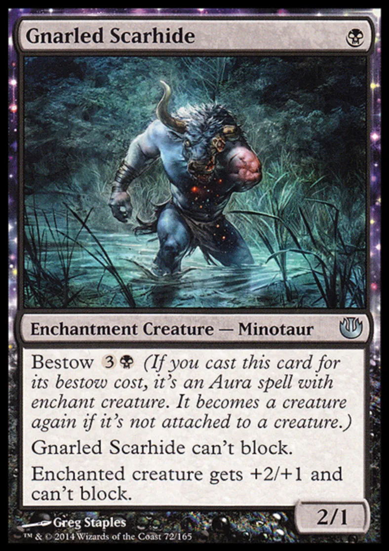 | Oracle Text | Bestow {{3}}{{b}} (If you cast this card for its bestow cost, it's an Aura spell with enchant creature. It becomes a creature again if it's not attached to a creature.) Gnarled Scarhide can't block. Enchanted creature gets +2/+1 and can't block. | ||