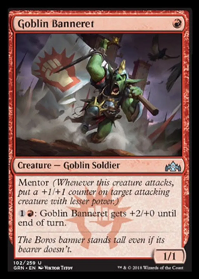 | Oracle Text | Mentor (Whenever this creature attacks, put a +1/+1 counter on target attacking creature with lesser power.) {{1}}{{r}}: Goblin Banneret gets +2/+0 until end of turn. | ||