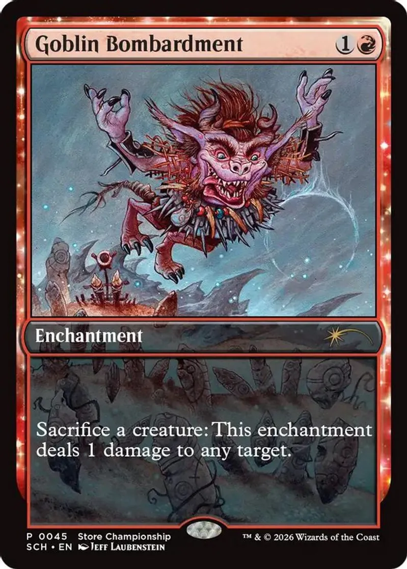 Magic: the Gathering (mtg) Promo enchantment Goblin Bombardment from Game Day Promos (pMGD) last updated 2026-02-24 14:53:02