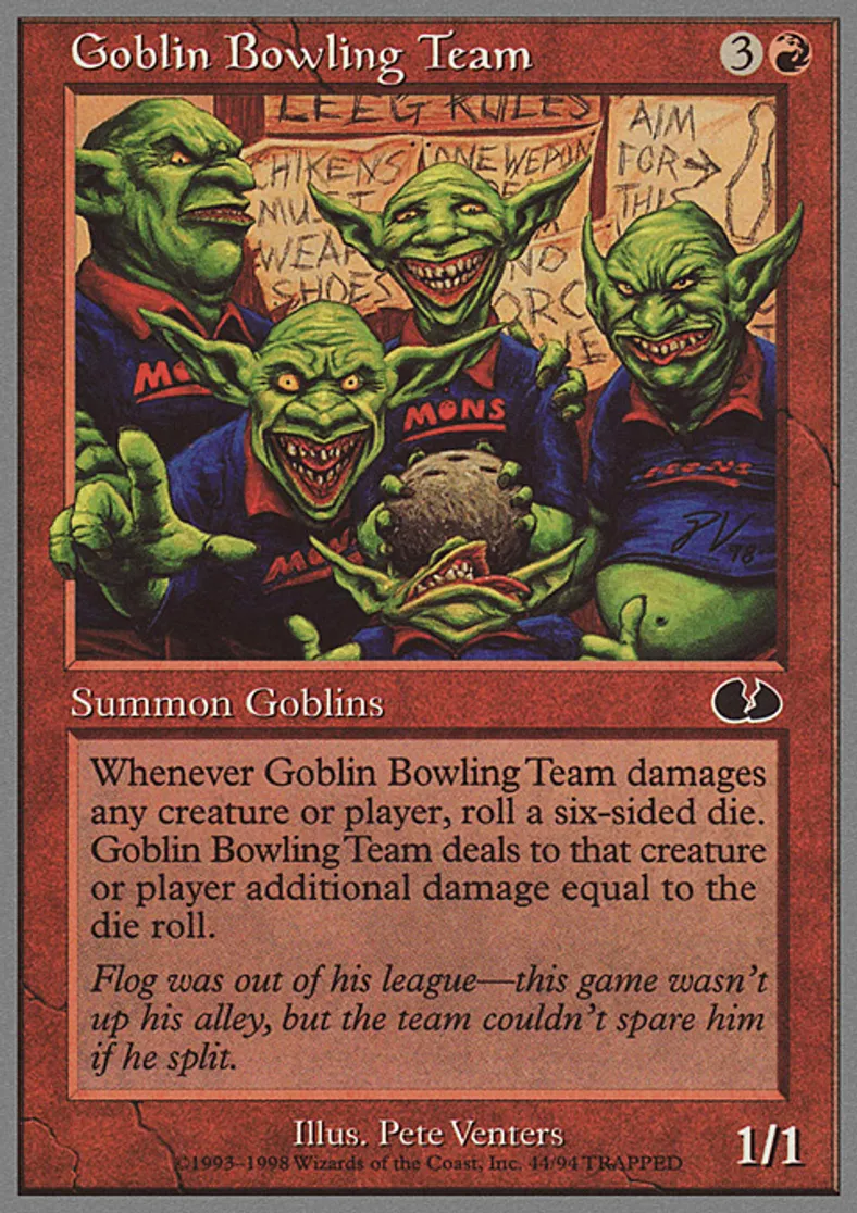| Oracle Text | Whenever Goblin Bowling Team damages any creature or player, roll a six-sided die. Goblin Bowling Team deals to that creature or player additional damage equal to the die roll. | ||