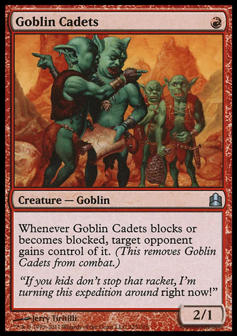 | Oracle Text | Whenever Goblin Cadets blocks or becomes blocked, target opponent gains control of it. (This removes Goblin Cadets from combat.) | ||
