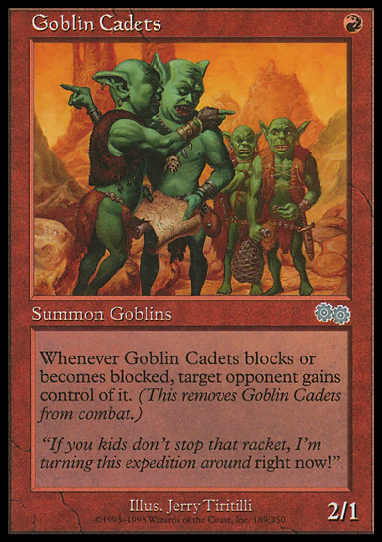 | Oracle Text | Whenever Goblin Cadets blocks or becomes blocked, target opponent gains control of it. (This removes Goblin Cadets from combat.) | ||