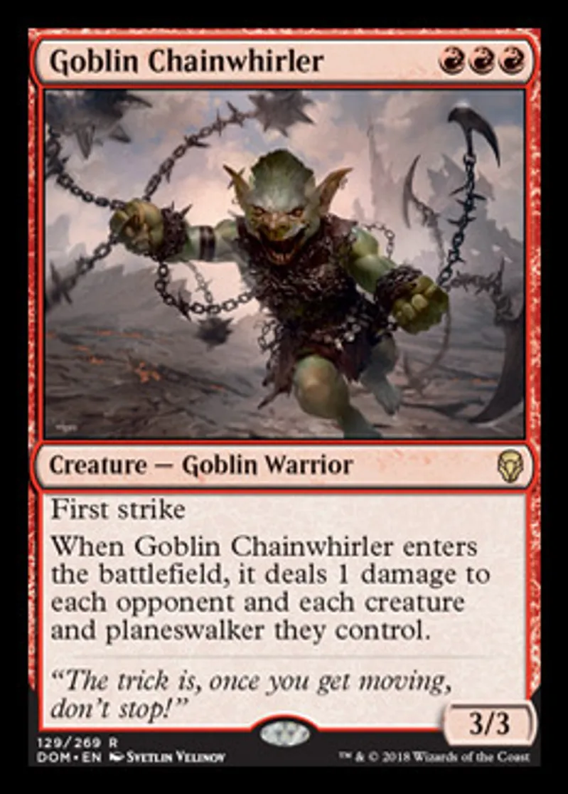 | Oracle Text | First strike When Goblin Chainwhirler enters the battlefield, it deals 1 damage to each opponent and each creature and planeswalker they control. | ||