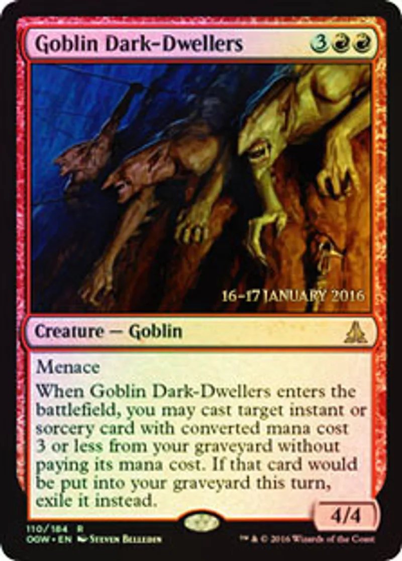 | Oracle Text | Menace\r\nWhen Goblin Dark-Dwellers enters the battlefield, you may cast target instant or sorcery card with converted mana cost 3 or less from your graveyard without paying its mana cost. If that card would be put into your graveyard this turn, exile it instead. | ||