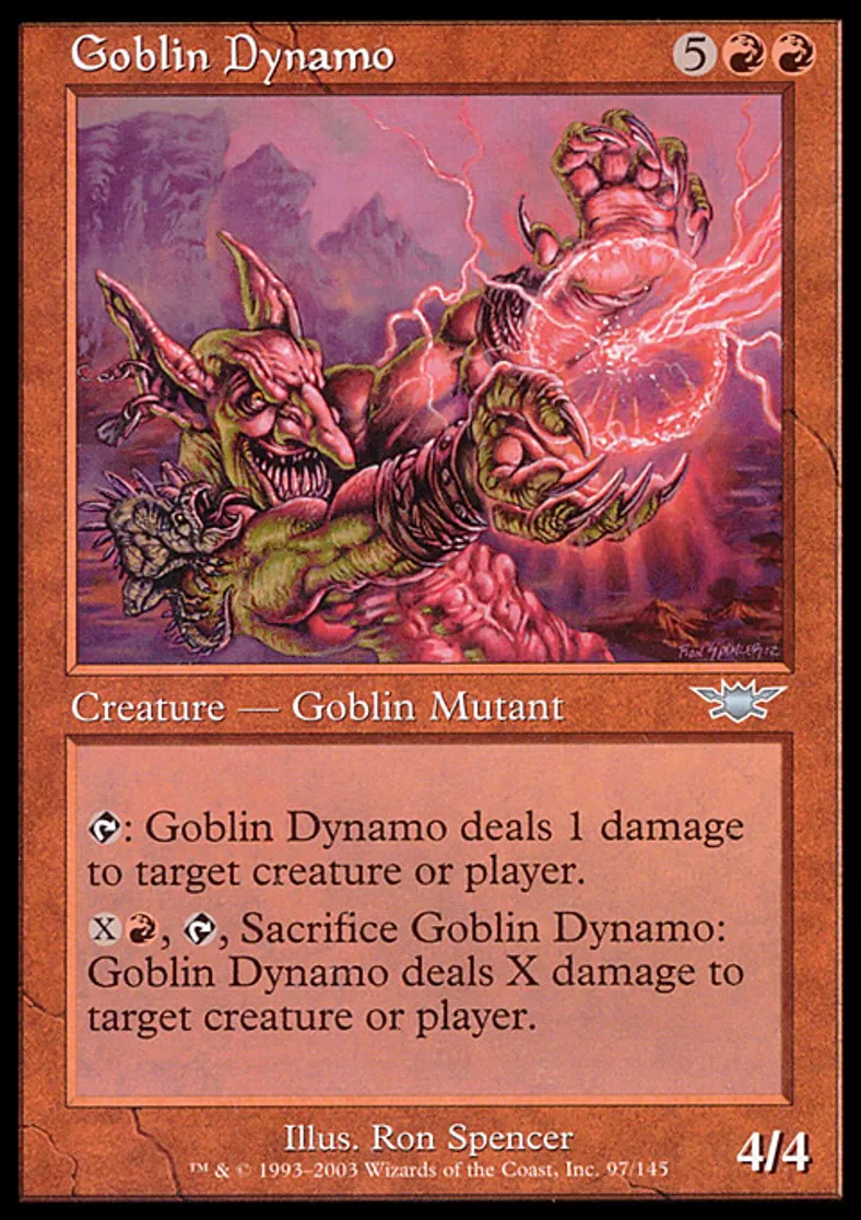 | Oracle Text | {{t}}: Goblin Dynamo deals 1 damage to target creature or player. {{x}}{{r}}, {{t}}, Sacrifice Goblin Dynamo: Goblin Dynamo deals X damage to target creature or player. | ||