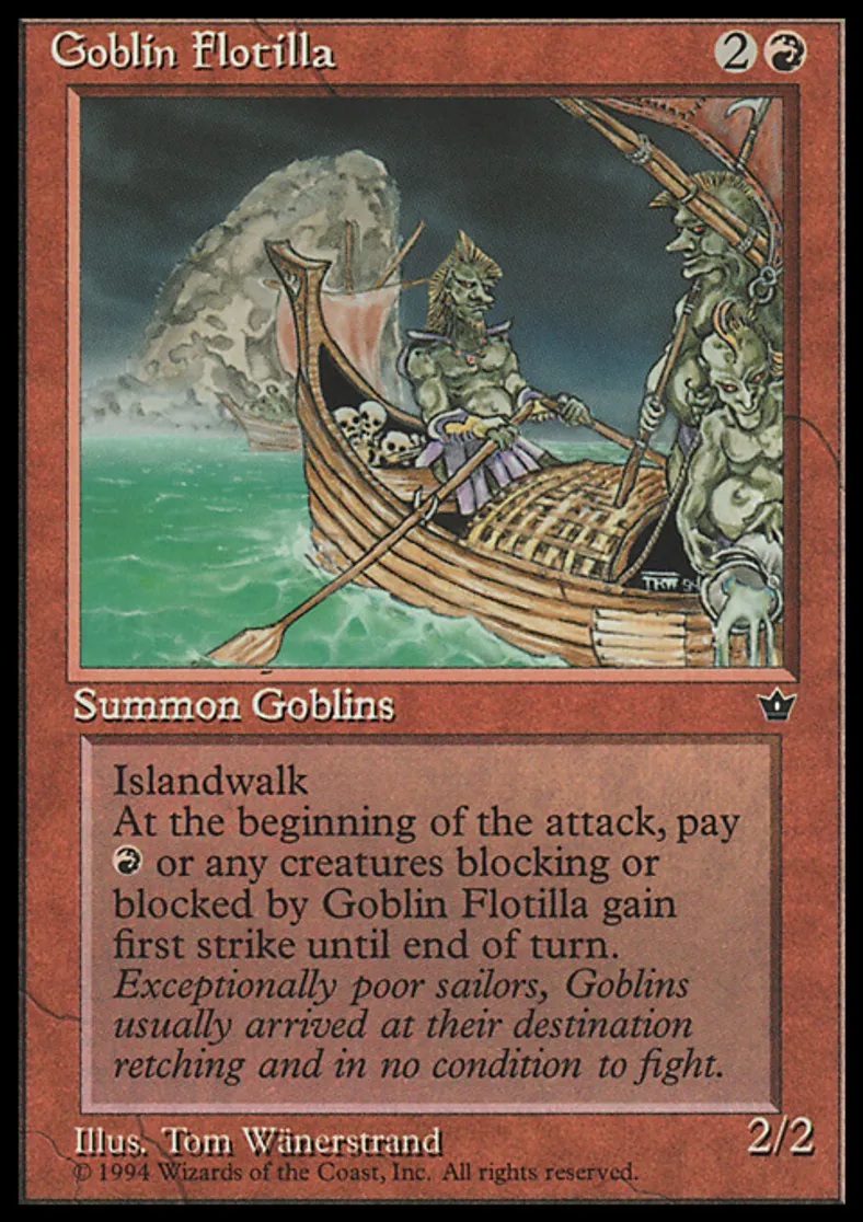 | Oracle Text | Islandwalk At the beginning of combat, unless you pay {{r}}, whenever Goblin Flotilla blocks or becomes blocked by a creature this combat, that creature gains first strike until end of turn. | ||