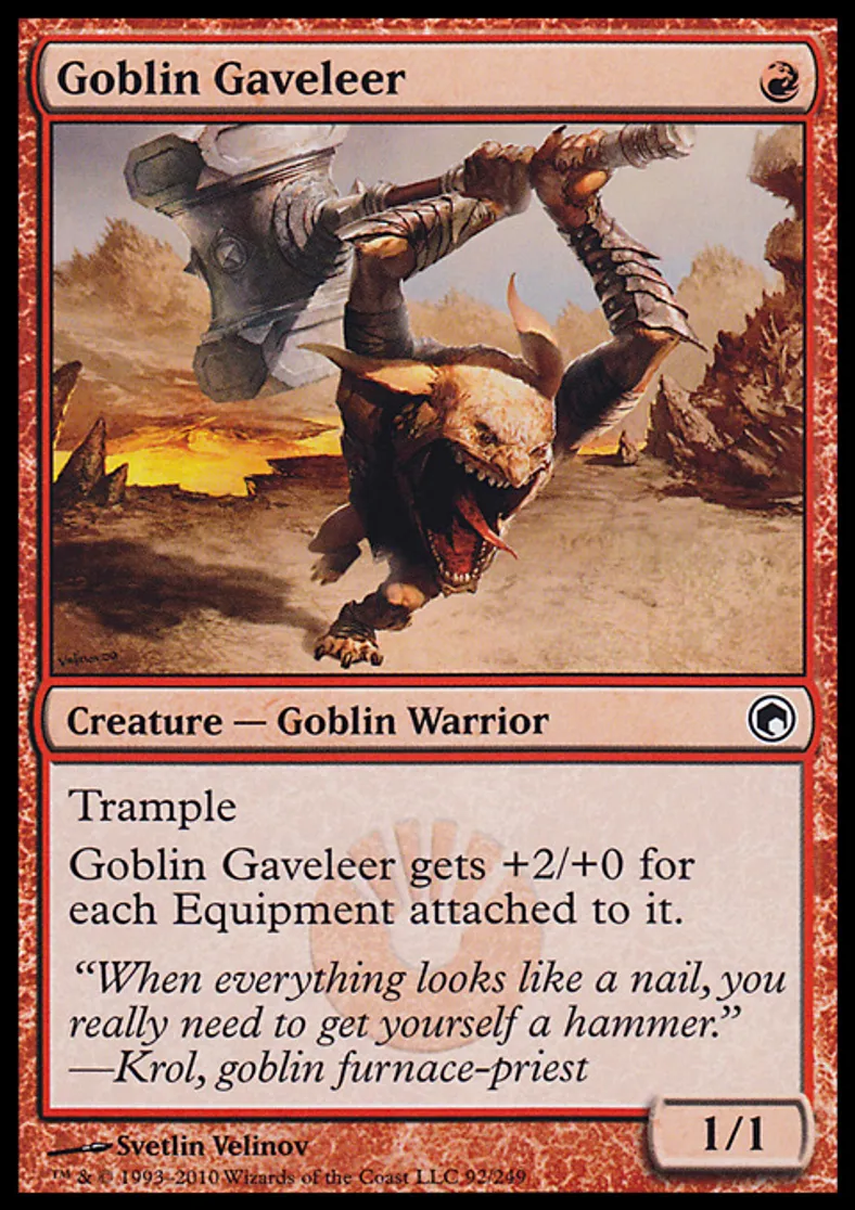| Oracle Text | Trample Goblin Gaveleer gets +2/+0 for each Equipment attached to it. | ||