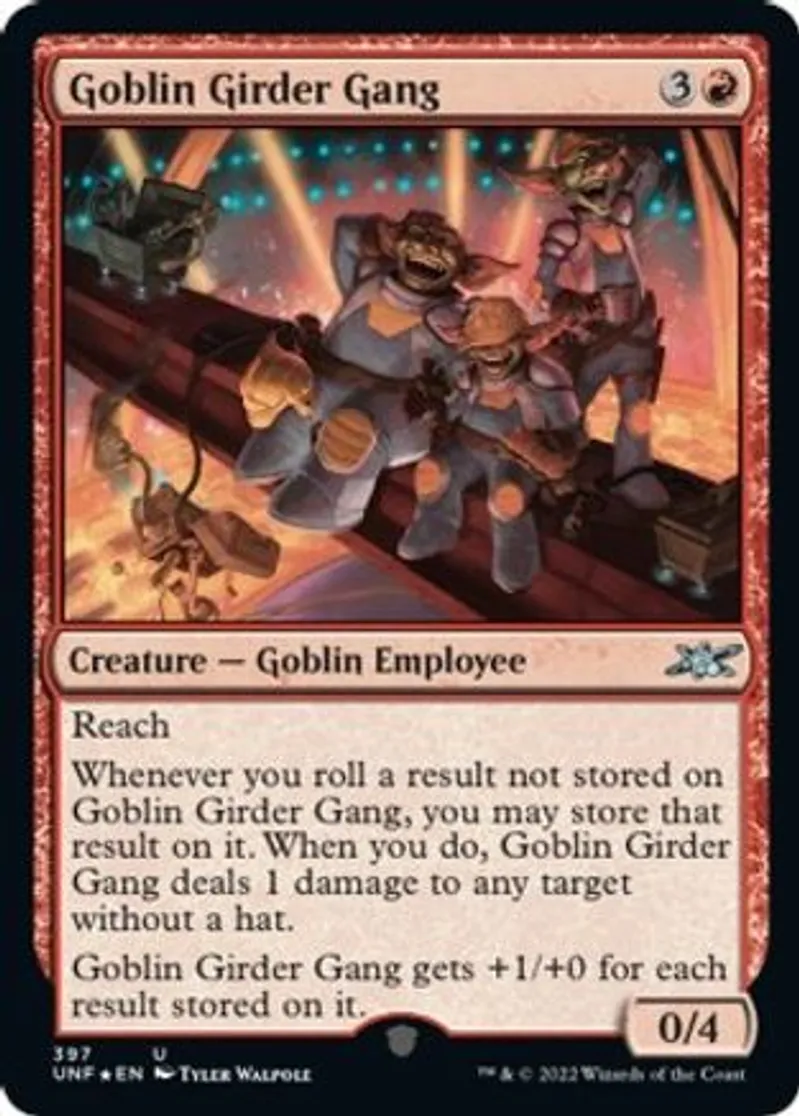 Whenever you roll a result not stored on Goblin Girder Gang, you may store that result on it. When you do, Goblin Girder Gang deals 1 damage to any target without a hat.
