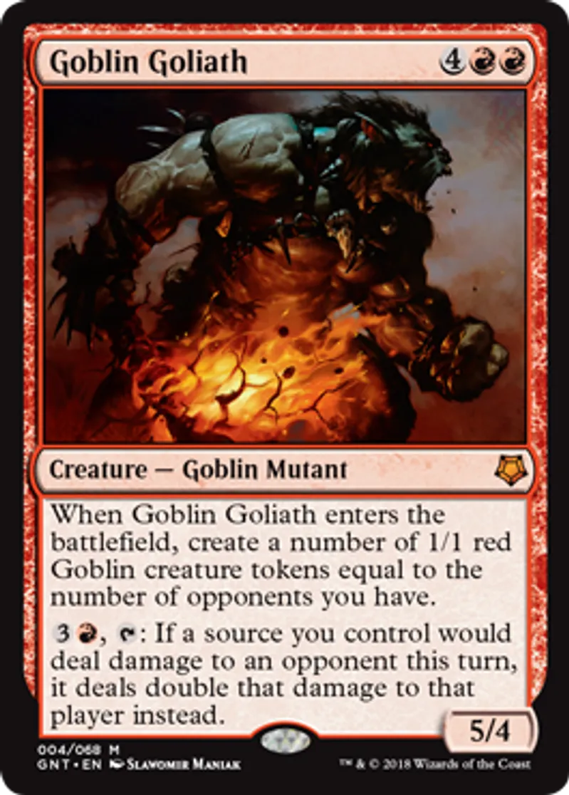 | Oracle Text | When Goblin Goliath enters the battlefield, create a number of 1/1 red Goblin creature tokens equal to the number of opponents you have. {{3}}{{r}}, {{t}}: If a source you control would deal damage to an opponent this turn, it deals double that damage to that player instead. | ||
