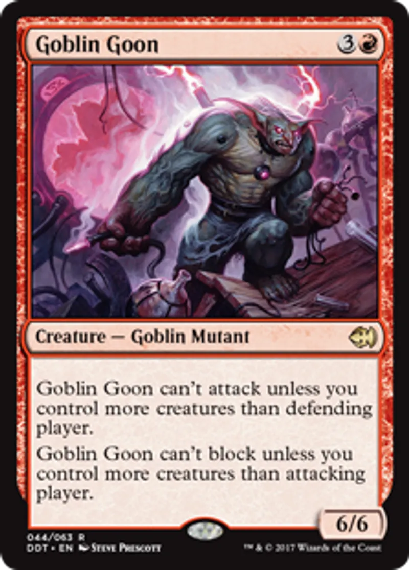 | Oracle Text | Goblin Goon can't attack unless you control more creatures than defending player. Goblin Goon can't block unless you control more creatures than attacking player. | ||