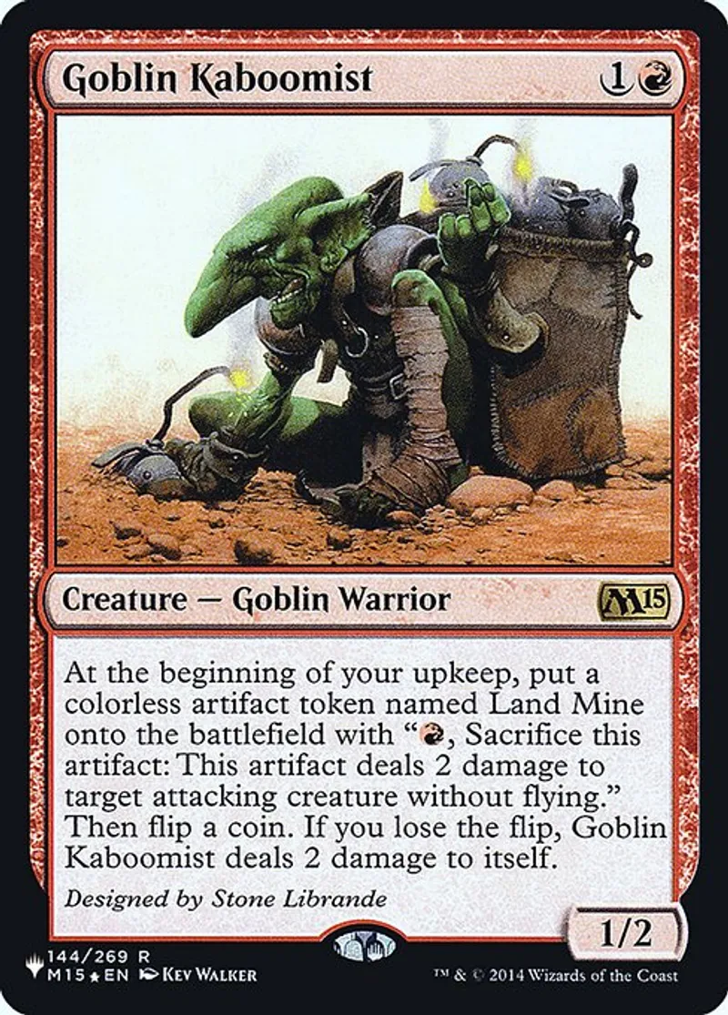 | Oracle Text | At the beginning of your upkeep, create a colorless artifact token named Land Mine with "{{r}}, Sacrifice this artifact: This artifact deals 2 damage to target attacking creature without flying." Then flip a coin. If you lose the flip, Goblin Kaboomist deals 2 damage to itself. | ||
