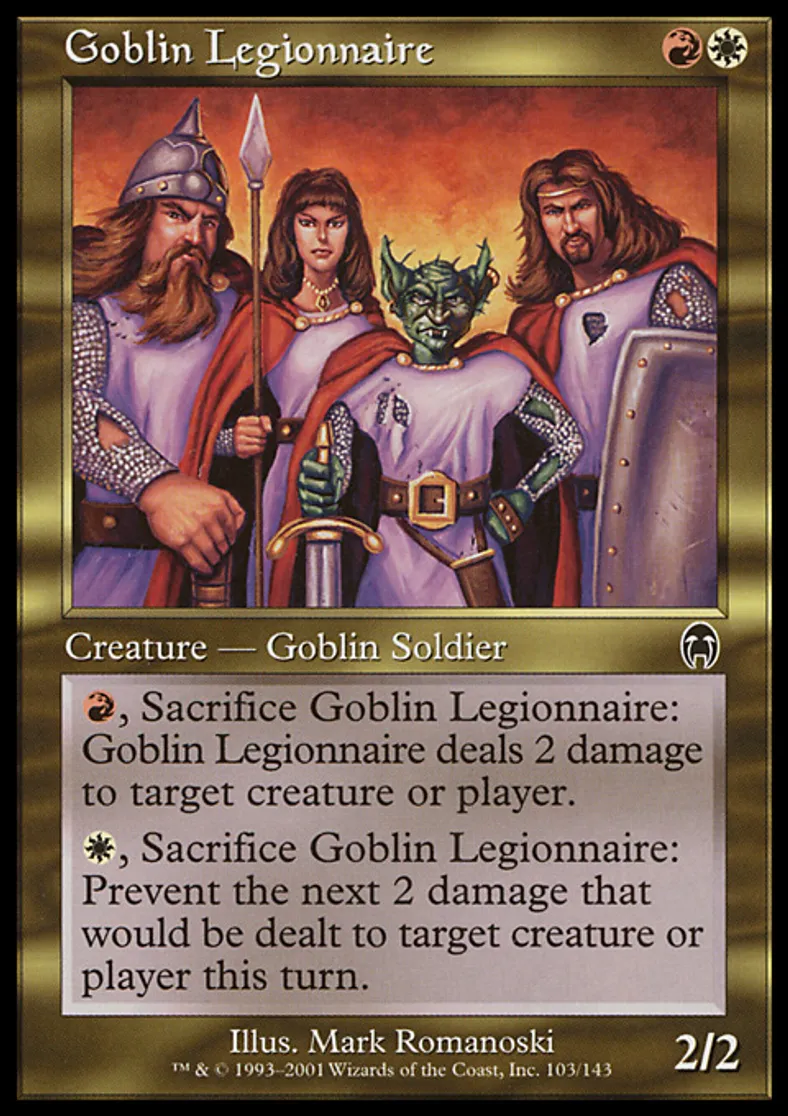 | Oracle Text | {{r}}, Sacrifice Goblin Legionnaire: Goblin Legionnaire deals 2 damage to target creature or player. {{w}}, Sacrifice Goblin Legionnaire: Prevent the next 2 damage that would be dealt to target creature or player this turn. | ||