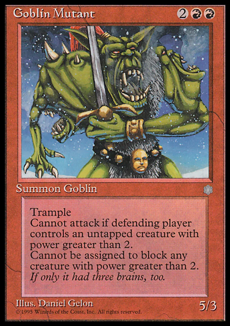 | Oracle Text | Trample Goblin Mutant can't attack if defending player controls an untapped creature with power 3 or greater. Goblin Mutant can't block creatures with power 3 or greater. | ||