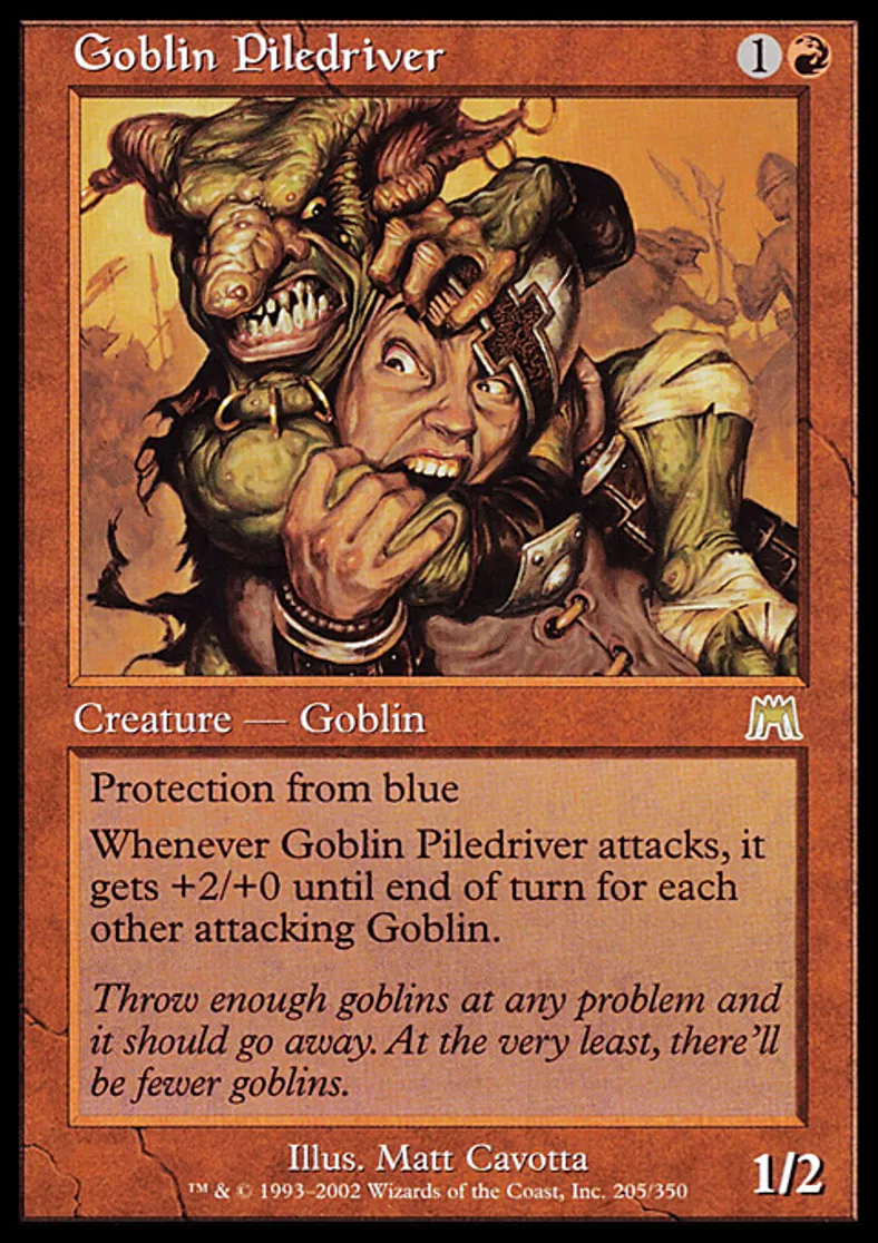 | Oracle Text | Protection from blue Whenever Goblin Piledriver attacks, it gets +2/+0 until end of turn for each other attacking Goblin. | ||
