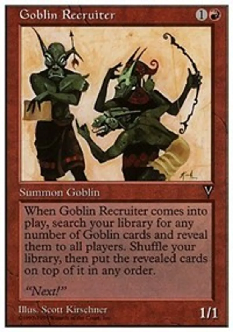 | Oracle Text | When Goblin Recruiter comes into play, search your library for any number of Goblin cards and reveal them to all players. Shuffle your library, then put the revealed cards on top of it in any order. | ||