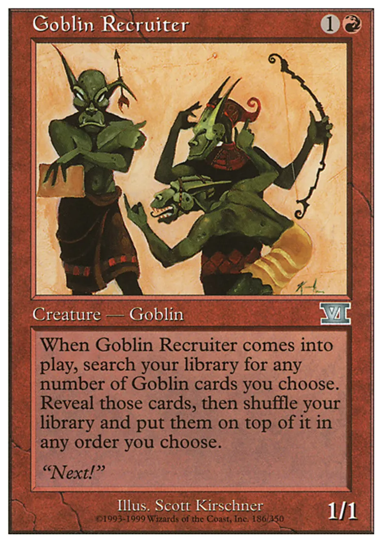 | Oracle Text | When Goblin Recruiter enters the battlefield, search your library for any number of Goblin cards and reveal those cards. Shuffle your library, then put them on top of it in any order. | ||