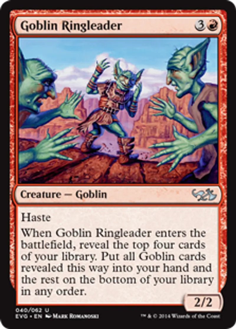 | Oracle Text | Haste When Goblin Ringleader enters the battlefield, reveal the top four cards of your library. Put all Goblin cards revealed this way into your hand and the rest on the bottom of your library in any order. | ||