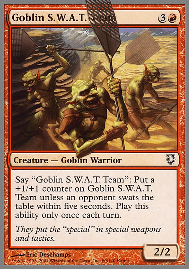 | Oracle Text | Say "Goblin S.W.A.T. Team": Put a +1/+1 counter on Goblin S.W.A.T. Team unless an opponent swats the table within five seconds. Play this ability only once each turn. | ||
