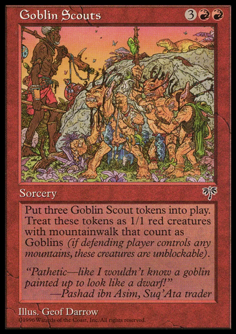 | Oracle Text | Put three 1/1 red Goblin Scout creature tokens with mountainwalk onto the battlefield. | ||