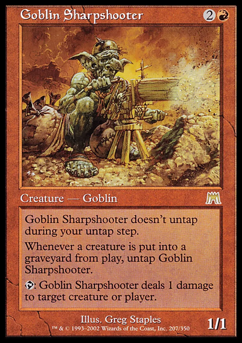 | Oracle Text | Goblin Sharpshooter doesn't untap during your untap step. Whenever a creature dies, untap Goblin Sharpshooter. {{t}}: Goblin Sharpshooter deals 1 damage to target creature or player. | ||