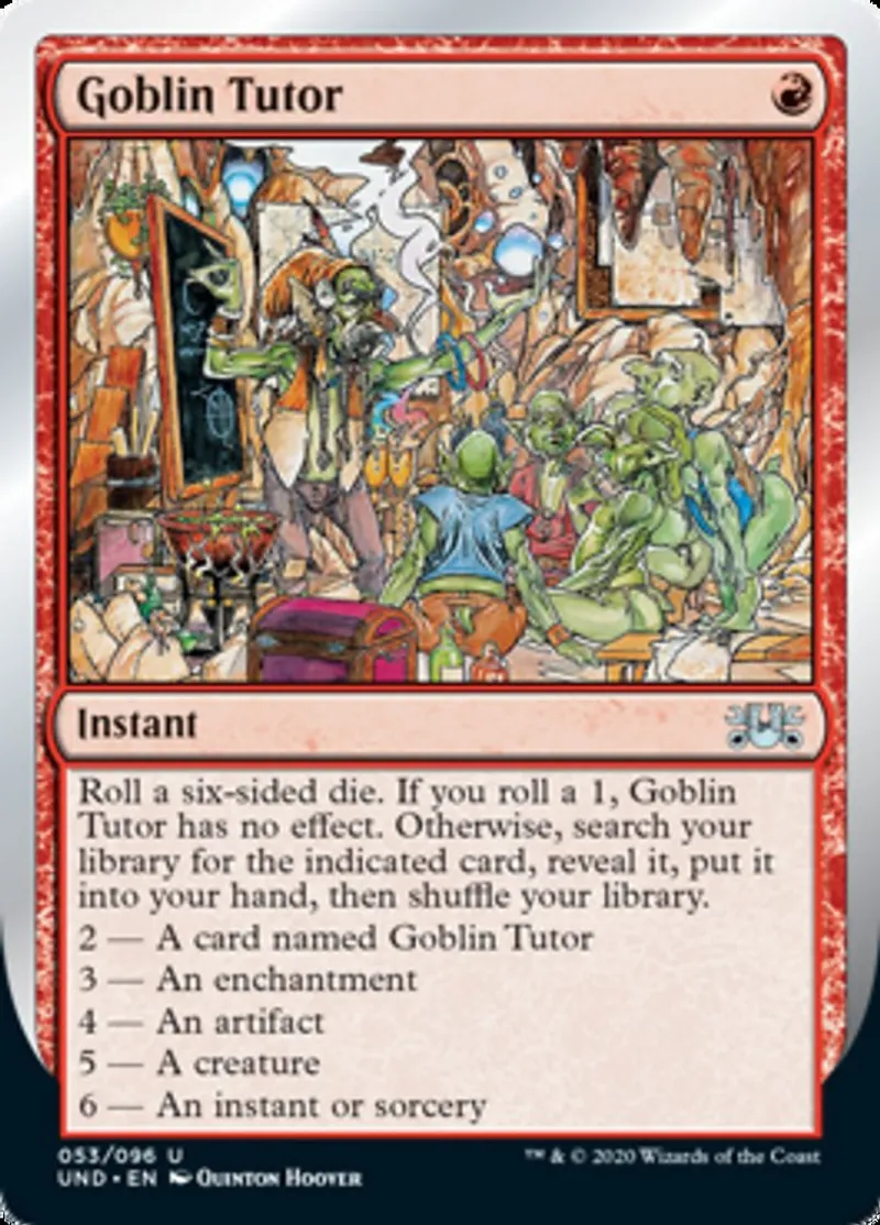 | Oracle Text | Roll a six-sided die. If you roll a 1, Goblin Tutor has no effect. Otherwise, search your library for the indicated card, reveal it, put it into your hand, then shuffle your library.