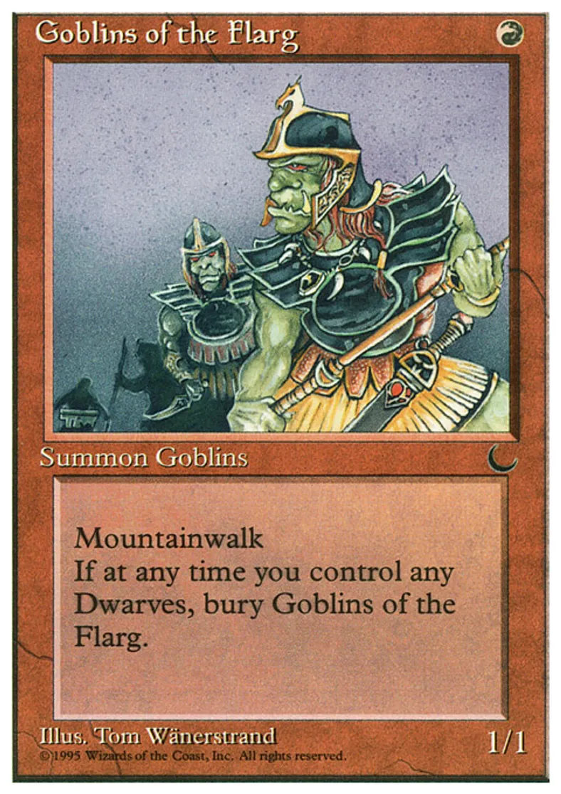 | Oracle Text | Mountainwalk When you control a Dwarf, sacrifice Goblins of the Flarg. | ||